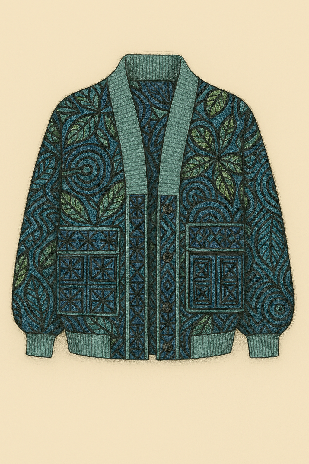 The Urban Roots Men's Collection is crafted for the modern man who moves with purpose and style. This standout cardigan features a vibrant tapestry of spirals, leaves, and geometric motifs in rich green and teal tones — a nod to heritage with a contemporary twist.